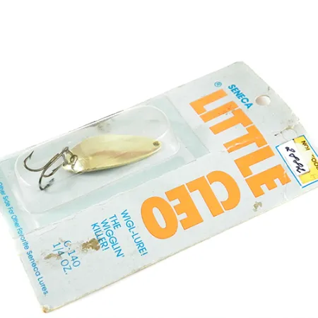 Auksuotas paviršius suteikia nesenstančią išvaizdą šiai 7g (1/4 oz) blizgei – svorio kategorijai, kuri dešimtmečius sėkmingai naudojama tiek gėluose, tiek sūriuose vandenyse. Ši 4 cm (1 1/2") ilgio Seneca Little Cleo turi prekės kodą 2882 ir reprezentuoja svarbią žūklės įrankių istorijos erą iki tol, kol prekės ženklą devintojo dešimtmečio pradžioje įsigijo „Acme“. Šis egzempliorius ypač vertingas dėl įgaubtoje pusėje esančio įspausto Hula šokėjos atvaizdo – detalės, kuri, daugelio patyrusių žvejų nuomone, prisidėjo prie legendinio masalo statuso prieš supaprastinant jo dizainą. Masalas yra nenaudotas, įvertintas 6 balais ir išlieka originalioje vintažinėje pakuotėje. Pakuotės nugarėlėje nurodyta „Seneca“ padalinio vieta Providense, RI, bei pateiktos instrukcijos spiningavimui ar velkiavimui gaudant upėtakius, lašišas ir lydekas. Komplektacijoje yra gamyklinis trišakis kabliukas, neturintis jokių senėjimo ar nusidėvėjimo žymių.