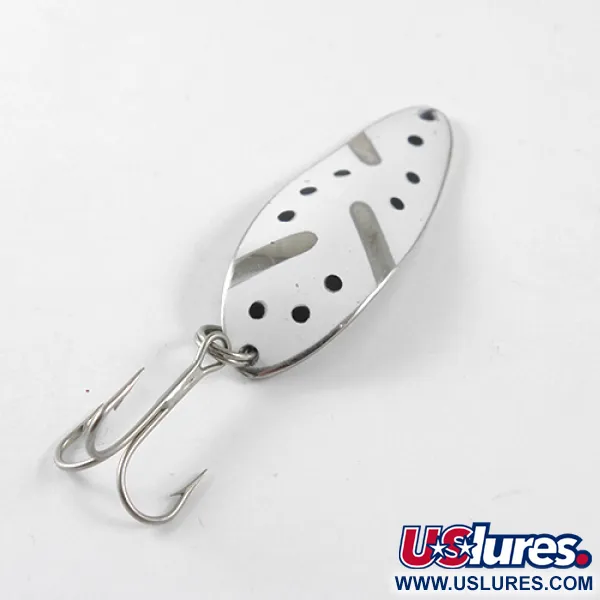 Išskirtinė balto emalio apdaila, papuošta juodais taškeliais ir matomomis nikelio juostelėmis, apibūdina šios blizgės priekinę dalį. 1/3 oz (10 g) sverianti „Little Cleo (Hula Girl)“ turi ryškų „SENECA LURE“ spaudą ant poliruoto nikelio nugarėlės – tai jos gamybos JAV dar prieš „Acme“ erą ženklas. Šis 1 3/4" (4,5 cm) pavyzdys, žymimas prekės kodu 1441, turi ikonišką šokėjos graviravimą, kuris, daugelio žvejų nuomone, yra istoriškai sėkmingo masalo paslaptis. Skirtingai nei šiuolaikinėse versijose, šioje „Seneca“ gamybos blizgėje išlikusi detali hula šokėjos figūra, sujungta su tvirtu trišakiu kabliuku, pritvirtintu žiedeliu. Nikelio ir baltos spalvos derinys išlieka ryškus ant 5/5 būklės korpuso. Kolekcininkai dažnai ieško šių originalių „Seneca“ gaminių, nes siluetas buvo specialiai suprojektuotas prieš prekės ženklo pasikeitimą devintojo dešimtmečio pradžioje. Galinė dalis atspindi šviesą per poliruotą metalą, sudarydama kontrastą dažytam viršutiniam paviršiui.