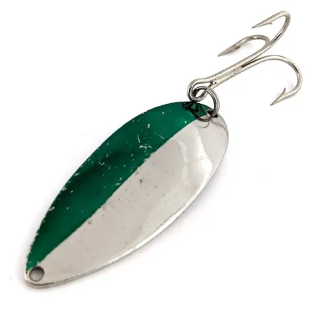 Priekinę šios 21 g (3/4 oz) blizgės pusę dengia ryškus įstrižas metalizuotos smaragdo žalios ir poliruoto nikelio spalvų derinys. Kitoje pusėje aiškiai išspaustas atpažįstamas „Hula Girl“ šokėjos simbolis – tai originalios „Seneca“ produkcijos ženklas, naudotas iki prekės ženklo perleidimo „Acme“ įmonei devintojo dešimtmečio pradžioje. Šis konkretus egzempliorius, pažymėtas prekės kodu 15240, pasižymi klasikinio lašo formos profiliu, dėl kurio „Little Cleo“ dešimtmečius yra nepakeičiamas masalas žvejų dėžutėse. Reverse taip pat matomi įspaudai „WIGL LURE“ ir „3/4 OZ“, nurodantys vintažinę kilmę. Blizgė turi tvirtą trišakį kabliuką, pritvirtintą patikimu žiedeliu. Metalinis paviršius išlieka blizgus, o įdėmiai apžiūrėjus matomi nedideli paviršiniai įbrėžimai, todėl būklė vertinama solidžiu 4/5 balu. Kolekcininkai dažnai ieško būtent šių versijų dėl detalios šokėjos graviūros, kuria daugelis patyrusių žvejų vis dar pasitiki kaip suteikiančia pranašumą metimo metu. Skylutė priekinėje dalyje yra tiksliai išmušta tiesioginiam valo rišimui arba jungimui per suktuką su segtuku.