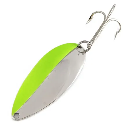 Ši solidi, 21 g (3/4 uncijos) svorio vartiklė išsiskiria akį traukiančiu dvispalviu dizainu – viena pusė nikeliuota, kita neoninės žalios spalvos. 6,5 cm (2 1/2 colio) ilgio masalas ant įgaubtosios nikeliuotos pusės turi įspaustą kultinį „Hula Girl“ šokėjos siluetą – tai išskirtinis „Seneca Lure Company“ laikotarpio bruožas. Daugelis patyrusių žvejų iki šiol vertina būtent šią versiją su šokėja, kuri buvo gaminama dar prieš „Acme“ įsigijimą devintojo dešimtmečio pradžioje, kai šis graviravimas buvo panaikintas. Šis egzempliorius, pažymėtas prekės kodu 21764, yra puikios būklės (5/5) – paviršius išlaikė ryškumą, o furnitūra yra originali. Ši JAV pagaminta klasikinė vartiklė pasižymi svoriu, reikalingu tolimiems metimams į gilius vandenis, kur nikelio blizgesys yra efektyviausias.