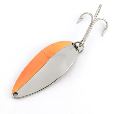 Ši per vidurį tolygiai padalinta nikelio ir ryškios oranžinės spalvos „Seneca“ vartiklė iškart patraukia akį. 6,5 cm ilgio ir 21 g svorio masalas kitoje pusėje turi klasikinį išspaustą šokėjos atvaizdą – tai originalios „Seneca Lure“ gamybos ženklas iki 1980-ųjų metų „Acme“ įsigijimo. Patyrę kolekcininkai vertina būtent šiuos „Hula Girl“ variantus, nes vėlesnėse serijose graviruotos figūros nebeliko. Poliruotas metalas yra 5/5 būklės, be jokių ryškių gamyklinės dangos nusidėvėjimo ženklų. Vartiklės nugarėlėje išspaustas prekės kodas 22112 bei aiškiai nurodytas svoris ir kilmės šalis. Tvirtas trišakis kablys patikimai pritvirtintas apačioje, tad masalas puikiai tinka tiek spiningavimui, tiek velkiavimui.