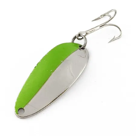 Šios 4,5 cm ilgio blizgės priekinę dalį puošia nikelio ir žalios spalvos danga – tai klasikinis originalios „Seneca“ gamybos linijos braižas. 10 g sverianti blizgė kitoje pusėje turi legendinį „Hula Girl“ antspaudą – graviruotę, kuri simbolizavo erą iki devintojo dešimtmečio, kol prekės ženklą perėmė „Acme“. Dauguma patyrusių žvejų tiki, kad būtent ši šokėja buvo slaptoji masalo sėkmės JAV vandenyse priežastis. Šis konkretus egzempliorius, pažymėtas prekės kodu 23255, yra puikiai išsilaikęs radinys iš JAV, išlaikęs nepriekaištingą 5/5 būklę. Furnitūra blizga, o štampuota grafika išliko ryški, suteikdama galimybę prisiliesti prie laikų, kai „Seneca Lure“ gamino blizges su ypatingu charakteriu, kurio šiuolaikiniams modeliams dažnai trūksta. Žalios spalvos fragmentas ryškiai kontrastuoja su atspindinčiu nikeliu, kas užtikrina puikų masalo matomumą pravedimo metu.