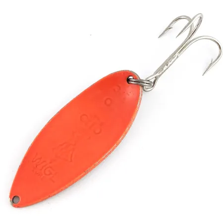 Sverianti 21 g (3/4 uncijos), ši „Seneca“ blizgė pasižymi ikonišku „Hula Girl“ siluetu, aiškiai įspaustu jos metaliniame korpuse. Ši konkreti „Little Cleo“, pažymėta prekės kodu 23349, yra 6,5 cm (2 1/2 colio) ilgio ir išsiskiria dviejų spalvų deriniu: ryškiai oranžine išore ir poliruoto nikelio vidine (įgaubta) puse. Įspaudas išliko itin ryškus, pabrėžiantis „WIGL“ žymą, „Little Cleo“ pavadinimą ir „Seneca“ prekės ženklo identifikatorių. Furnitūrą sudaro tvirtas jungiamasis žiedelis ir tvarkingas trišakis kablys – abu elementai yra puikios būklės. 5/5 būklės įvertinimas atspindi puikiai išlaikytą išvaizdą: oranžinis pigmentas yra ryškus ir sodrus, o nikelio pusė išlaiko gilų, veidrodinį atspindį. Ši svorio kategorija yra tradicinis pasirinkimas tolimiems metimams, kai ieškoma stambesnių žuvų gilesniuose vandenyse. Išgraviruota „Hula Girl“ figūra išlieka skiriamuoju istoriniu „Cleo“ serijos bruožu, o šiame egzemplioriuje ji matoma be jokių smulkių linijų nusidėvėjimo ženklų.