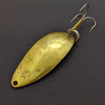 Šis auksuotas paviršius iškart patraukia akį ant šios 14 g blizgės, pasižyminčios klasikinio lašo formos profiliu, kuris dešimtmečius tarnauja žvejams. Būklė vertinama 3/5, metalo paviršius atrodo matęs gyvenimo su tam tikrais nusidėvėjimo ženklais, liudijančiais jo istoriją vandenyje, tačiau jis išlieka tvirtas ir paruoštas kolekcijai ar metimui. Apvertę 5,5 cm kūnelį, rasite metale įspaustą kultinę „Hula Girl“ šokėją – tai originalios „Seneca“ gamybos ženklas, naudotas prieš prekės ženklui pereinant „Acme“ įmonei 9-ojo dešimtmečio pradžioje. Daugelis žvejų veteranų pasitiki būtent šia versija, žymima kodu 24090, ir šventai tiki, kad šokėjos atvaizdas yra jos legendinio efektyvumo paslaptis. Furnitūra pasižymi tvirtu trišakiu kabliu, pritvirtintu per patikimą žiedelį, užtikrinantį masalo vientisumą kovojant su agresyviomis plėšriomis žuvimis. Išdidžiai paženklintas kaip JAV gaminys, šis egzempliorius reprezentuoja laikus, kai masalų gamyboje didelis dėmesys buvo skiriamas detaliam štampavimui, kurio šiuolaikinės versijos dažnai nebeturi.
