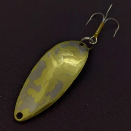 Šios 14 g blizgės kitoje pusėje aiškiai įspaustas egzotiškos šokėjos siluetas – originalios „Seneca“ eros gamybos skiriamasis ženklas. Šis konkretus pavyzdys, kurio prekės kodas yra 24364, išsiskiria kultiniu dviejų atspalvių (nikelio ir aukso) padengimu bei klasikine kalta priekinės dalies tekstūra. 5,5 cm ilgio ašaros formos korpusas komplektuojamas su tvirtu trišakiu kabliuku, pritvirtintu standartiniu žiedeliu. Istorinį „Hula Girl“ graviravimą įkvėpė „Seneca“ įkūrėjo Charlie Clarko susižavėjimas šokėjos judesiais; šio dizaino elemento buvo atsisakyta, kai devintajame dešimtmetyje įmonę perėmė „Acme“. Sunkus metalinis korpusas yra specialiai pritaikytas tolimiems metimams į gilesnius vandens sluoksnius, kur dvispalvis paviršius užtikrina kontrastingus šviesos atspindžius. Paviršius gerai išlaikytas, matomi tik nedideli laiko ženklai, todėl šis egzempliorius vertinamas 4 balais iš 5. Šalia skylutės valui tvirtinti vis dar įskaitomas autentiškas užrašas „Wig-L-Lure“, patvirtinantis gamybos šaknis Niujorke.