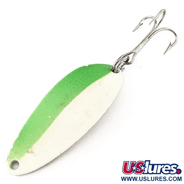 Pusiau žalia ir pusiau balta spalva dengia šios 1/3 oz (10 g) blizgės viršų, identifikuodama ją kaip tikrą Seneca gaminį. 1 3/4" (4,5 cm) ilgio 12190 modelis pasižymi geidžiama „Hula Girl“ šokėja ant nikeliuotos nugarėlės – ši detalė buvo pašalinta Acme perėmus prekės ženklą devintojo dešimtmečio pradžioje. Daugelis patyrusių žvejų vis dar pasitiki originaliomis Seneca versijomis, tikėdami, kad iškalta šokėja suteikė subtilų vizualinį efektą, kurio trūksta šiuolaikiniams pakaitalams. Masalas yra 5/5 būklės, atrodo išskirtinai švarus, su originalia furnitūra. Šis „Glow“ variantas, skirtas prasto matomumo sąlygoms, įsikrauna šviesoje ir gilesniame vandenyje sukuria šviečiantį žalią siluetą. Tvirtą konstrukciją sudaro nikeliuotas korpusas ir aštrus trišakis kablys, pritvirtintas tvirtu žiedeliu, pabrėžiant to meto JAV meistriškumą.