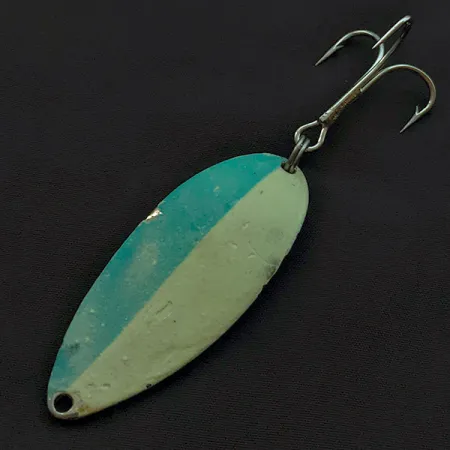 Ši klasikinė 21 g (3/4 oz) svorio vartiklė yra puikus 23040 modelio pavyzdys iš Seneca Lure laikotarpio. 6,5 cm (2 1/2 colio) ilgio masalo priekinė dalis pasižymi išskirtine dviejų spalvų apdaila: ji vertikaliai padalinta į sodrią mėlyną ir kreminę baltą, kuri pasižymi liuminescencinėmis (šviečiančiomis tamsoje) savybėmis. Kitoje masalo pusėje – itin vertinama nikelio danga su iškalta originalia „Hula Girl“ šokėja. Tai autentiškumo ženklas iš laikų, kol prekės ženklo dar nebuvo perėmusi „Acme“ kompanija devintojo dešimtmečio pradžioje. Daugelis patyrusių kolekcininkų mano, kad būtent šis šokėjos atvaizdas pelnė masalui puikią reputaciją tarp žvejų. Furnitūra išlieka tvirta: masalas turi patikimą trišakį kabliuką, pritvirtintą prie tvirto žiedelio. Masalo būklė vertinama 4 balais iš 5: ant išgaubtos pusės matomi natūralūs naudojimo ženklai – nedideli dažų nusitrynimai, pro kuriuos matyti metalas. Lašo formos vartiklė skirta spiningavimui arba velčiavimui ir yra puikus pasirinkimas gaudant stambias plėšrias žuvis. Kitoje pusėje taip pat iškaltas užrašas „WIGL LURE“, būdingas tam laikotarpiui Seneca gamybos stiliui.