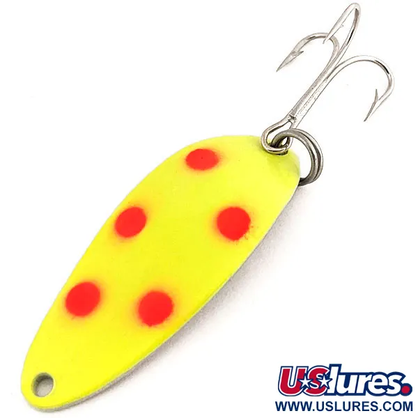 Penki ryškiai raudoni taškai išsiskiria ryškiai geltoname fluorescenciniame fone ant šios klasikinės blizgės. 1/3oz (10 g) svorio ir 1 3/4" (4,5 cm) ilgio metalinis korpusas sukomplektuotas su aštriu trišakiu kabliu ir tvirtu žiedeliu. Esant prastam apšvietimui, paviršius atskleidžia savo UV spindėjimo savybes – tai techninis elementas, sukurtas matomumui giliame ar drumstame vandenyje. Šis konkretus pavyzdys, pažymėtas prekės kodu 12785, ant nikeliuotos nugarėlės turi legendinį „Hula Girl“ šokėjos spaudą. Šis ženklas liudija autentišką Seneca Lure gamybą JAV, dar prieš prekės ženklo įsigijimą Acme devintojo dešimtmečio pradžioje. Daugelis patyrusių žvejų ieško būtent šių originalių Seneca versijų, tikėdami, kad šokėjos motyvas buvo pagrindinė šio masalo istorinės sėkmės paslaptis. Masalas yra nenaudotas.