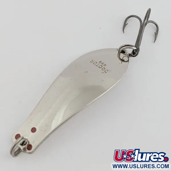 Ši „Prescott Spinner“ nikliuota blizgė, kurios įgaubtoje pusėje įspaustas ženklas „DOCTOR 255“, yra 4,5 cm (1 3/4") ilgio. 7 g (1/4 oz) svoris ir vientisas žalvarinis korpusas leidžia blizgei išlaikyti stabilų žaidimą prie skirtingų traukimo greičių. Trys maži raudoni taškai, esantys šalia kilpelės valui, sukuria subtilų vizualinį kontrastą ryškiai metalinei apdailai. Liekna karklo lapo forma sukurta imituoti smulkių žuvelių profilį – toks dizainas dažnai pasirenkamas žvejojant lydekas ar upėtakius. Šis konkretus egzempliorius yra 5/5 būklės, paviršius švarus, o ženklinimas puikiai įskaitomas. Gaminys, identifikuojamas pagal prekės kodą 24455, yra puikiai išlaikytas vidurio amžiaus žvejybos įrangos pavyzdys.