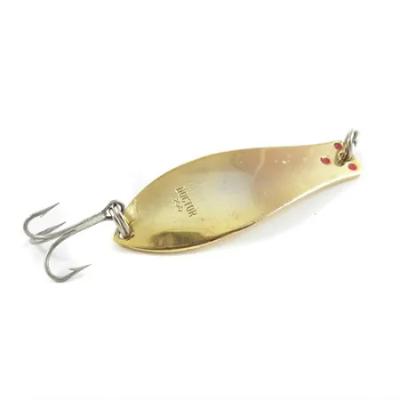 Įgaubtoje metalo pusėje aiškiai išspaustas identifikatorius „DOCTOR 255“ – firminis „Prescott Spinner“ kompanijos ženklas. Ši blizgė su auksine danga sveria 1/4 uncijos (7 g), jos ilgis – 1 3/4 colio (4,7 cm). Prie pavadėlio kilpos yra trys ryškūs raudoni taškai, suteikiantys klasikinį akcentą. Masalas, kurio produkto kodas 2902, apginkluotas paprastu, aštriu trišakiu kabliuku, pritvirtintu žiedeliu, taip išlaikant originalią šios amerikietiškos klasikos paskirtį. Būklė vertinama tvirtu 4/5, paviršius labai švarus, o tai pabrėžia auksinės dangos kokybę. Meistrystė atspindi ilgaamžiškumo standartus, kurie anksčiau buvo būdingi Viskonsino žūklės įrankių gamybai – metalinis korpusas išlaikęs originalią formą ir spindesį.