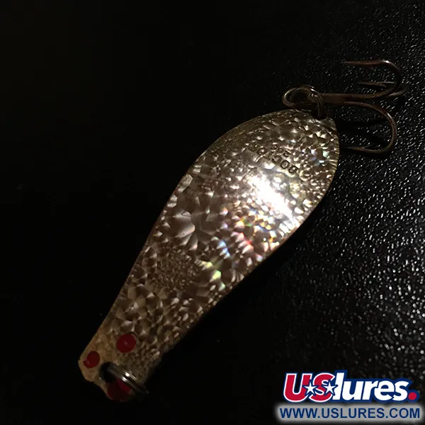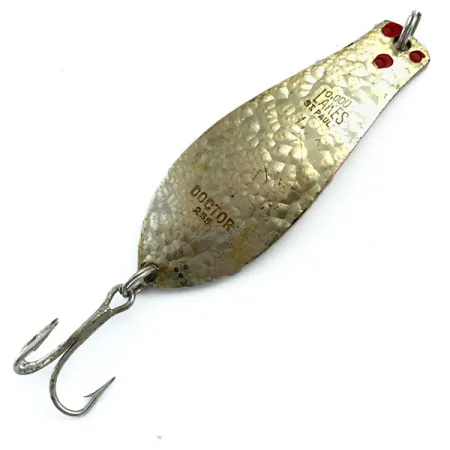 Kalinėta tekstūra 1/4 uncijos (7 g) metalinio korpuso nugarinėje pusėje gražiai kontrastuoja su reta auksine Crystal holografine apdaila priekyje. Metale aiškiai įspausti žymėjimai 10,000 LAKES ST. PAUL kartu su modelio pavadinimu DOCTOR 255, nurodantys Prescott Spinner kilmę Minesotoje, JAV. 1 3/4" (4,7 cm) ilgio masalas yra išskirtinės būklės, vertinamas 5/5, o jo atspindintis auksinis paviršius ir raudoni akcentai išlieka ryškūs. Konstrukcijoje numatytas standartinis trišakis kablys, skirtas spiningavimui ar velčiavimui. Ši konkreti versija, atpažįstama pagal prekės kodą 5470, išsiskiria unikaliomis šviesą atspindinčiomis savybėmis, kurias suteikia auksinio krištolo tekstūros paviršius.