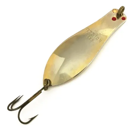 Ši 1/3 oz (10 g) svorio blizgė išlieka universalus pasirinkimas įvairioms gėlavandenėms žuvims. Paauksuotame metale aiškiai įspaustas „DOCTOR 265“ pavadinimas, nurodantis, kad tai klasikinis JAV gamybos masalas. Šis 2 1/2" (6,5 cm) ilgio egzempliorius pasižymi dviem ryškiais raudonais taškais šalia viršutinės kilpelės, sukuriančiais vizualinį kontrastą metaliniam korpusui. Ją sudaro tvirtas trišakis kablys, pritvirtintas žiedeliu uodegoje, ir atitinkamas žiedelis galvutėje valui tvirtinti. Gaminio kodas 7693, aukso danga turi lengvų naudojimo žymių, tačiau išlaiko tvirtą 4/5 būklės įvertinimą. Išgaubta pusė išlaiko blizgesį, o įgaubta nugarėlė pasižymi kiek matiniu, sendinto aukso tonu, būdingu to meto metaliniams masalams.