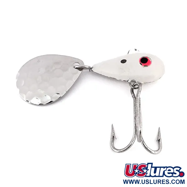 Ši 1/2 oz (14 g) sverianti lašo formos uodeginė sukrė (tail spinner) yra sunkus skęstantis masalas, skirtas pasiekti giliai esančias struktūras. 1 1/2 colio (4 cm) švininis korpusas padengtas švariais baltais dažais, akcentuotas rankomis dažytomis akimis su raudonais apvadais ir juodais vyzdžiais. Gamintojo Luhr Jensen (produkto kodas 10292) sukurtas modelis pasižymi nikeliuotu lapeliu, kuris užtikrina dvigubą vizualinį patrauklumą. Viena lapelio pusė yra mušta (kalta), kad maksimaliai atspindėtų šviesą įvairiomis sąlygomis, o lygioje kitoje pusėje aiškiai įspaustas pavadinimas „LITTLE GEORGE“. Šis masalas yra 5/5 būklės, išlaikęs originalų dažų blizgesį ir ryškias metalines detales. Vienas aštrus trišakis kablys pritvirtintas prie pilvelio per tvirtą vielos karkasą, einantį per švininį korpusą. Kompaktiškas profilis ir didelis tankis yra specialiai sukurti tolimiems metimams ir greitam skandinimui, siekiant pasiekti pakibusius žuvų būrius arba dugno plėšrūnus.