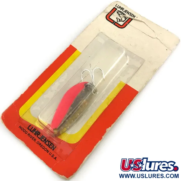 Išgaubtos pusės kaltas žalvario paviršius užtikrina stiprų atspindį, kuris kontrastuoja su ryškia fluorescencine raudona apdaila priekinėje dalyje. 1 1/2 colio (4 cm) ilgio ir 1/4 uncijos (7 g) svorio ši vintažinė Luhr Jensen Little Jewel vartiklė yra klasikinė Hood River, Oregono valstijos, istorijos dalis. Masalas vis dar originalioje pakuotėje, nenaudotas, atitinkantis 6 lygio kolekcinę būklę. Kortelės nugarėlėje išlikęs originalus brūkšninio kodo lipdukas su prekės kodu 1013-014-399, nurodančiu, kad tai „Special Finish“ modelis, pagamintas 1994-10. Fluorescencinė danga sukurta dideliam matomumui, ji reaguoja į UV šviesą ir pritraukia dėmesį gilesniuose vandens sluoksniuose. Furnitūrą sudaro ryškus sidabrinis trišakis kabliukas ir tvirtas jungiamasis žiedelis, būdingi patvariai Luhr Jensen konstrukcijai, kuria šis prekės ženklas garsėjo iki gamybos nutraukimo. Šis egzempliorius yra išsaugotas 10-ojo dešimtmečio vidurio gamybos standartų pavyzdys – nuo litografuotos pakuotės iki specifinio metalo štampavimo.