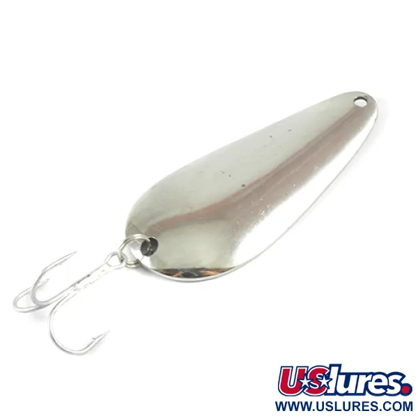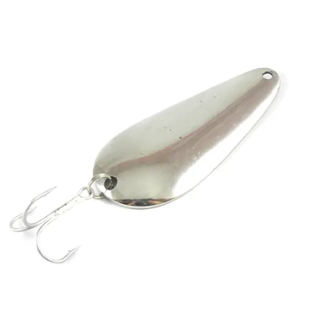 Nikelio apdaila, kaip ir ši 3 colių (7,5 cm) blizgė, buvo pagrindinis „Lindy / Little Joe“ asortimento bruožas, užtikrinantis puikų matomumą įvairiomis vandens sąlygomis. Ši klasikinė metalinė blinkė su įspaustu „Little Joe“ pavadinimu sveria 3/5 uncijos (17 g), todėl yra puikus pasirinkimas tiek spiningavimui, tiek velkiavimui. Šis pavyzdys, pažymėtas prekės kodu 2971, demonstruoja paprastą amerikietišką gamybą, būdingą prekės ženklo produkcijai JAV. Trišakis kablys saugiai pritvirtintas tvirtu žiedeliu – tai paprastas, bet efektyvus dizainas, patikrintas laiko. Kalbant apie būklę, atspindintis paviršius išlieka ryškus ir gerai išsilaikęs, nusipelnęs 4/5 įvertinimo. Atidžiau pažvelgus į išgaubtą pusę, matomos švarios lašo formos linijos, būdingos vidurio amžiaus blizgių dizainui, skirtam gaudyti šviesą. Anga galvutėje yra tiksliai išmušta, paruošta segtukui arba tiesioginiam valo rišimui.
