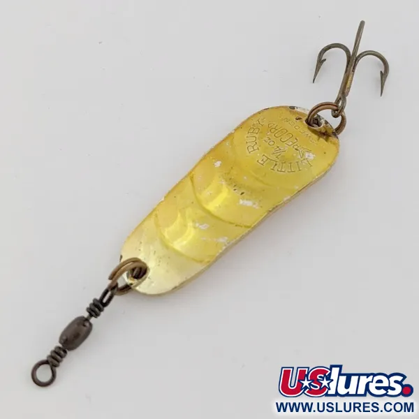 Aiškiai ant auksuoto paviršiaus išspaustas žymėjimas identifikuoja šį 7 g (1/4 oz) egzempliorių kaip klasikinį švedų gamintojo dizainą. Auksinė danga atspindi šviesą per išskirtinį banguotą laiptuotą profilį su trimis ryškiomis briaunomis, skirtomis vandeniui stumti tolygaus traukimo metu. Įgaubtoje pusėje autentiškas „LITTLE RUBY RECORD SWEDEN“ įspaudas išlieka ryškus ir įskaitomas. Priekyje sumontuotas vintažinis cilindrinis suktukas, subalansuojantis galinėje dalyje esantį bronzuotą trišakį kabliuką. Šis konkretus gaminys, identifikuotas produkto kodu 24522, pasižymi gerai išlaikytu paviršiumi, įvertintu 4/5 būkle. Lygus blizgės vidus užtikrina nuoseklų ryškų blyksnį, papildantį tekstūruotą išorę.