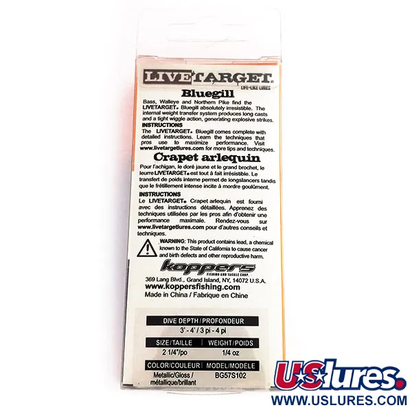 0,9–1,2 m nėrimo gylis paverčia šį tikrovišką masalą universaliu pasirinkimu žvejybai sekliose vietose. LiveTarget Koppers Bluegill, kurio produkto kodas 9844, pasižymi Crapiet Arlequin spalvinimu, tiksliai atkartojančiu ausytąjį saulešerį. Jo ilgis yra 5,6 cm, o svoris – 7 g. Šis plaukiantis masalas, skirtas ešerių ir lydekų žvejybai spiningu, turi aštrius Daiichi kabliukus, matomus per skaidrią pakuotę. Masalo būklė įvertinta 6 balais, tai reiškia, kad jis nenaudotas ir išsaugotas originalioje dėžutėje. Spalvinimas išsiskiria sudėtingais vertikaliais dryžiais ir tamsia dėmele ant žiaunų dangtelio, būdinga natūraliems saulešeriams.
