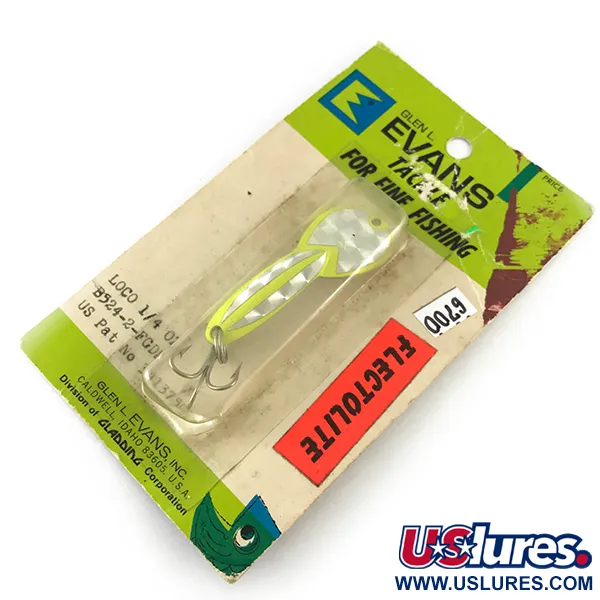 Ši 7 g (1/4 oz) sverianti Glen Evans Loco 2 pasižymi išskirtiniu fluorescenciniu geltonu kraštu, kuris reaguoja į UV šviesą. 5 cm (2") ilgio blizgė turi sidabrinį „Flectolite“ žvynelių rašto centrą, skirtą sklaidyti šviesą vandenyje. Šis modelis, kurio produkto kodas 6700, yra išlikęs originalioje senovinėje lizdinėje pakuotėje (blisteryje) iš Koldvelio, Aidaho valstijos. Masalas yra nenaudotas, o metalas ir apdaila išlaikę tokį patį blizgesį, kaip ir išvykus iš „Gladding Corporation“ gamyklos. Masalas apginkluotas vienu ant pilvelio pritvirtintu trišakiu kabliu ir tvirtu žiedeliu valui tvirtinti. Istoriškai Loco dizainas buvo naudojamas tiek spiningavimui, tiek velkiavimui, dažnai pasirenkamas lydekų ir kitų plėšrūnų žūklei sekliuose vandenyse iki 0,9 m gylio. Pakuotė pabrėžia Glen L. Evans palikimą – kurti įrankius, skirtus apgauti žuvį, o ne žveją.