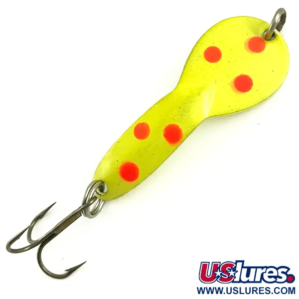 Šeši ryškūs raudoni taškai tiksliai išdėstyti ant fluorescencinio geltono šios 7 g (1/4oz) Glen Evans Loco 2 UV blizgės paviršiaus. 5 cm (2") ilgio modelis pasižymi didelio matomumo apdaila, sukurta reaguoti į ultravioletinius spindulius, o tai ypač efektyvu drumstame vandenyje arba esant prastam apšvietimui. Kitoje pusėje matomas švarus nikelio pagrindas su „LOCO 2“ identifikatoriumi viršutinėje kilpelėje. Šis masalas, skirtas tiek spiningavimui, tiek velkiavimui, dažniausiai naudojamas lydekų žūklei ramiuose vandenyse iki 1 m (3,3 pėdos) gylyje. Šis egzempliorius (kodas 5790) yra 5/5 būklės – dažai ir metalinės dalys neturi jokių naudojimo žymių. Tvirti žiedeliai laiko aštrų trišakį kabliuką, išlaikydami originalią gamyklinę konfigūraciją.