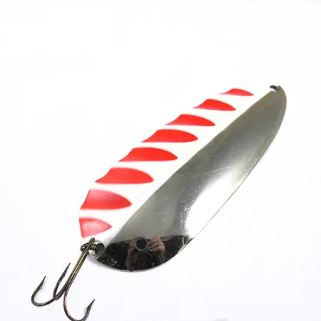 Ši 11,5 cm ilgio Kanadoje pagaminta klasika yra iškart atpažįstama iš ryškios Nikelio / Raudonos / Baltos apdailos. Šio 0734 modelio „Half Wave“ dizainas pasižymi aiškiais raudonais ir baltais įstrižais akcentais blizgaus nikelio fone. 38 g sverianti masyvaus metalo konstrukcija turi tamsintos apdailos trišakį kabliuką, pritaikytą velkiavimo ar tolimų metimų apkrovoms. Blizgės nugarėlėje išmuštas užrašas „LUCKY STRIKE CANADA“, žymintis jos regioninę kilmę. Šis egzempliorius įvertintas 4/5 balais, pasižymi blizgiu, gerai prižiūrėtu paviršiumi su minimaliomis naudojimo žymėmis. Kiekvienas Lucky Strike 4.5 Nickel Half Wave elementas – nuo žiedelio iki dažų sluoksnio – atspindi tiesmuką praktiškumą, būdingą senajai Ontariuje gamintai žvejybos įrangai.