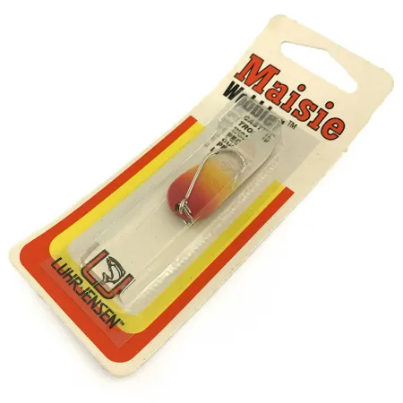 Ši 1/4oz (7 g) svorio Luhr Jensen Maisie vartiklė yra puikiai išlaikyta JAV Šiaurės vakarų žvejybos istorijos dalis. Shoshone/Brass spalvinimas pasižymi ryškiu raudonu gradientu, pereinančiu į auksinę geltoną spalvą ant žalvarinio korpuso. 1 1/2" (4 cm) ilgio masalas yra nenaudotas ir išlikęs originalioje gamyklinėje pakuotėje. Kitoje pakuotės pusėje yra lipdukas su SKU kodu 1081-014-0603, nurodančiu 2003 m. gruodžio 11 d. pagaminimo datą. Šis modelis, pažymėtas produkto kodu 18029, turi viensakį kabliuką ir tvirtą jungiamąjį žiedelį. Ant pakuotės matoma ikoniška Luhr Jensen šokančio upėtakio emblema, patvirtinanti gamybą JAV. Galinėje pusėje esantis įspėjimas apie šviną suteikia informacijos apie tuo laikotarpiu masalų gamyboje naudotas medžiagas.
