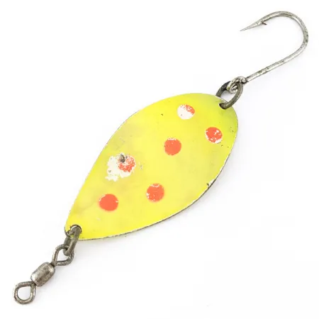 Šis „Luhr Jensen Manistee 4“ pasižymi ryškiu geltonu pagrindu su rankomis tapytais raudonais ir baltais taškais, o jo danga atspindi turtingą istoriją vandenyje. 14 g (1/2 oz) svorio blizgė turi lenktą profilį ir tvirtą konstrukciją, kurią JAV gamintojas sukūrė specialiai lašišų ir upėtakių žūklei. Šis konkretus masalas (prekės kodas 22595) pasižymi autentišku charakteriu – matomas natūralus dažų nusitrynimas dėl ankstesnio naudojimo, todėl jo būklė vertinama tvirtu 4/5. Furnitūra išlieka patikima: blizgė komplektuojama su vienu dideliu kabliu ir tvirtu suktuku, sujungtais žiedeliais. JAV gaminama „Manistee“ serija seniai pamėgta žvejų dėl savo ilgaamžiškumo ir klasikinės lašo formos metalinio korpuso. Raudonų taškų raštas geltoname fone yra tradicinis pasirinkimas, gerai matomas įvairaus skaidrumo vandenyje, pabrėžiantis meistriškumą, kuriuo garsėja „Luhr Jensen“.