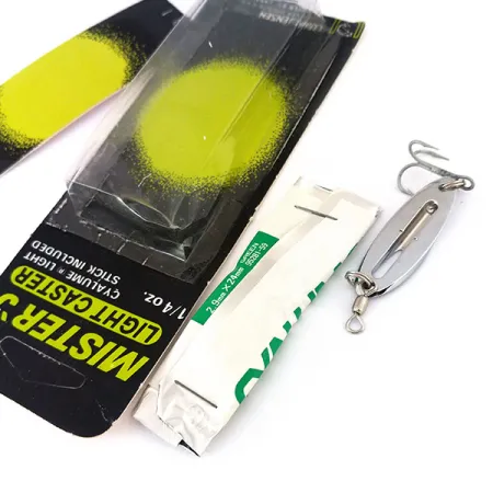 4 cm (1 1/2") ilgio šio Luhr Jensen Mister J Light Caster blizgės metalinis korpusas su išpjova yra specialiai sukurtas cheminiam šviesos pagaliukui įdėti, skirtam žvejybai prasto apšvietimo sąlygomis. Ši 7 g (1/4 oz) blizgė pasižymi aukšto poliravimo Nickel apdaila, kuri originalioje pakuotėje kartu su 12-88 gamybos datos antspaudu įvardijama kaip Chrome. Eksponatas yra nenaudotas originalioje senovinėje pakuotėje, kurioje taip pat yra sandarus 2,9 mm x 24 mm žalios spalvos Cyalume šviesos pagaliukas. Šios cheminės lazdelės iš pradžių buvo sukurtos siekiant atitikti karinius ir NATO standartus, užtikrinant pastovų švytėjimą, kad masalas būtų geriau matomas giliame ar drumstame vandenyje. Kataloge nurodytas prekės kodas 10978, komplektą sudaro standartinė furnitūra, pavyzdžiui, aštrus trišakis kablys ir suktukas. Šis USA pagamintas gaminys leidžia susipažinti su devintojo dešimtmečio pabaigos naktinės žvejybos techninėmis naujovėmis.