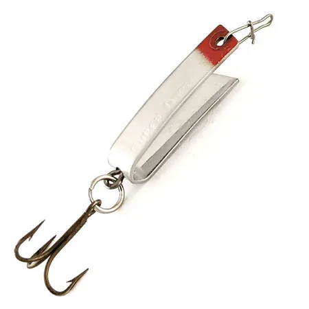 Šis 3 cm (1 1/4") ilgio metalinis masalas su išspaustu pavadinimu „SUPER DUPER“ ant lenkto šono yra unikali Amerikos žūklės įrankių istorijos dalis. Nikeliuotas korpusas paryškintas ryškiai raudonu galiuku, sukuriančiu didelio kontrasto vaizdą, kuris pagauna šviesą lenktu metaliniu paviršiumi. 2,3 g (3/32 oz) svorio masalas turi tvarkingą trišakį kabliuką, pritvirtintą žiedeliu, ir gamyklinį suktuką su segtuku lengvam tvirtinimui. Šis konkretus egzempliorius, kurio gaminio kodas 12373, yra 5/5 būklės, išlaikęs ryškų blizgesį tiek ant sidabrinio metalo, tiek ant raudonų dažų. U formos geometrija yra būdinga 501 modeliui – dizainui, kurį Luhr Jensen sukūrė JAV, kad užpildytų atotrūkį tarp blizgių ir sukrių lengvos klasės įrankių mėgėjams.