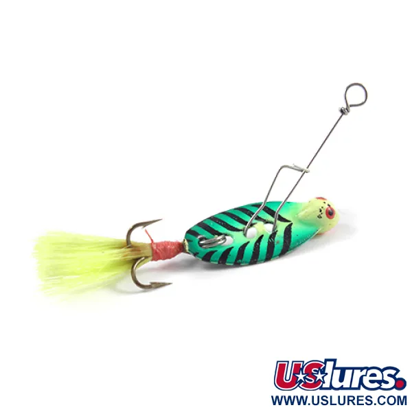 „Fire Tiger“ raštai ant lašo formos korpuso užtikrina puikų matomumą, naudojant ryškias juodas juostas virš sodraus žalios ir geltonos spalvos gradiento. Šis „Mann's Bait“ egzempliorius, pažymėtas produkto kodu 2434, yra puikios 5/5 būklės, o furnitūra ir dažai išlaikė originalią gamyklinę išvaizdą. 1/8 oz (4 g) svorio konstrukcija sukurta aplink vielos rėmą ir metalinį lapelį, kuris sukelia virpantį judesį vibracijai generuoti. Uodega turi plunksnuotą trišakį kabliuką, kuriame ryškiai geltonos gijos yra tvirtai pritvirtintos raudonu siūlu. Kilęs iš JAV, masalas pasižymi išskirtiniu galvos profiliu su nudažytomis raudonomis akimis, kurios tarnauja kaip taikinys puolimui. Vielos rėmas suformuotas taip, kad užtikrintų stabilų pateikimą, naudojimo metu laikant valą atokiau nuo virpančio korpuso.