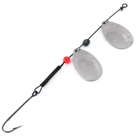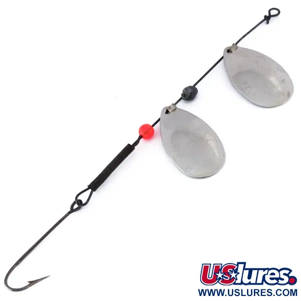 Nikeliuotas paviršius dengia šios 12,0 cm (4 3/4") tandeminis sukrės lapelius, užtikrindamas ryškų žybsėjimą įvairiomis vandens sąlygomis. 3,4 g (1/8 oz) sveriantis masalas sukonstruotas ant tamsios vielos ašies ir turi vieną raudoną karoliuką, tarnaujantį kaip kibimo taškas tarp apatinio lapelio ir kabliuko. Tandeminė konfigūracija naudoja du lašo formos lapelius, kad padidintų paviršiaus plotą, išlaikant liekną profilį metimui ar velkiavimui. Gale pritvirtintas vienšakis kabliukas su aštriu smaigaliu, sutvirtintas juoda mova stabilumui užtikrinti. Šis Marathon prekės ženklo masalas (kodas 10143) buvo pagamintas JAV, orientuojantis į ilgaamžiškumą. Būklė vertinama 4/5, pasižymi gerai išlaikyta metaline apdaila ir švaria furnitūra. Paprasta vielos kilpa priekyje leidžia rišti mazgą tiesiogiai arba naudoti nedidelį segtuką.