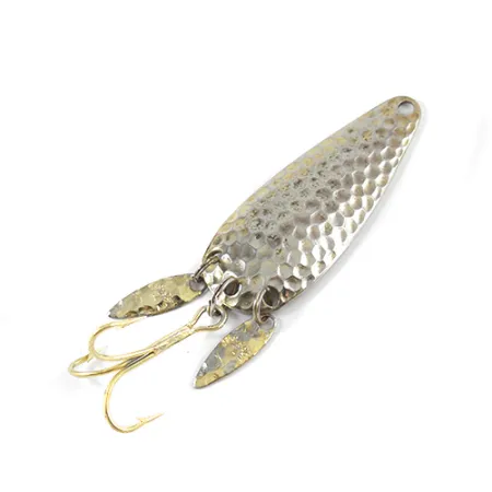 Kalto aukso apdaila puošia šios 6 cm (2 1/4") vartiklės priekinę dalį – tai klasikinio dizaino Marathon Bait Company kūrinys. Šis masalas, žymimas prekės kodu 2772, išsiskiria savo „Sonic Blades“ – dviem mažais metaliniais lašeliais, pritvirtintais prie galinio žiedelio, kurie suteikia papildomą blyksnį šalia auksinio atspalvio trišakio kablio. 12 g (2/5 oz) svorio tvirtas metalinis korpusas turi lygų, poliruotą vidų, kuriame aiškiu šriftu įspaustas gamintojo pavadinimas. Būklė vertinama 4/5 balais, paviršius gerai prižiūrėtas, išlaikęs originalų blizgesį ir struktūrinį vientisumą. Viena tvirtinimo skylutė siaurajame gale leidžia tiesiogiai rišti valą arba naudoti suktuką, kas būdinga vidurio amžiaus žūklės įrangai, randamai Didžiųjų ežerų žvejų dėžutėse.