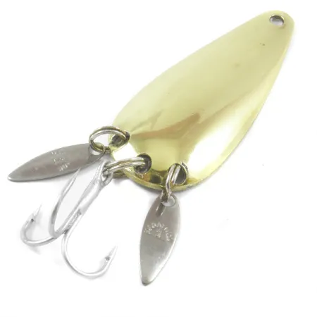 Žalvario atspalvio metalo vidinėje kreivėje aiškiai įspaustas Marathon pavadinimas – Viskonsine įsikūrusios įmonės, veikusios 1929–1979 m., ženklas. Ši 6 cm (2 1/4 colio) blizgė pasižymi išskirtiniu auksuotu korpusu, suderintu su dviem sidabro atspalvio pailgais mini lapeliais. Šie papildomi garsiniai lapeliai sumontuoti ant žiedelių kartu su sidabriniu trišakiu kabliuku, kad suteiktų profiliui papildomo blyksėjimo ir vizualinio sudėtingumo. Šis 12 g (2/5 oz) svorio JAV pagamintas masalas (produkto kodas 3200) pasižymi tvirta konstrukcija, būdinga vidurio amžiaus meistriškumui, randamam Marathon kataloge. Būklė vertinama 5/5, paviršius ryškus ir švarus, išlaikęs originalų metalinį blizgesį. Pagrindinio korpuso lašo formą papildo kontrastingas antrinių lapelių sidabras, padedantis užmaskuoti kabliuko gylį ir papildantis bendrą siluetą.
