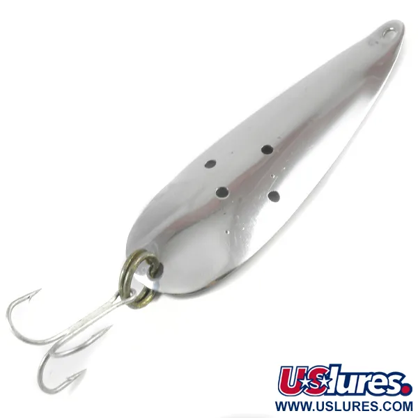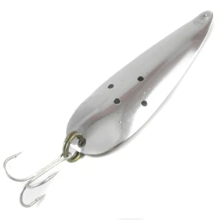 Poliruota nikelio apdaila suteikia itin ryškų atspindį šiai antikvarinei metalinei vartiklei, skirtai spiningavimui giliuose vandenyse arba velkiavimui. 18 g (2/3 oz) svorio ir 9,5 cm (3 3/4") ilgio masalo korpusas pasižymi keturiomis specifinėmis perforacijomis centre – tai unikalus Marathon Bait Company inžinerinis sprendimas. Šis Viskonsine įsikūręs gamintojas veikė 1929–1979 metais, o šis konkretus egzempliorius, pažymėtas prekės kodu 3224, atspindi tvirtą to laikmečio amerikietišką gamybą. Furnitūrą sudaro tvirtas žiedelis ir blizgus trišakis kabliukas, o bendra būklė vertinama 5/5. Gamintojo antspaudas aiškiai matomas įgaubtoje masalo pusėje, patvirtinantis jo istorinę vertę vidurio amžiaus žūklės reikmenų kolekcininkams.