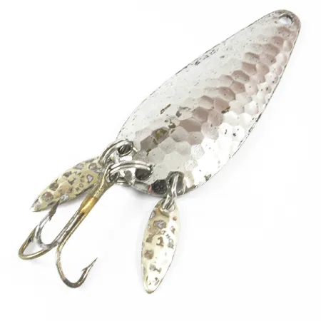 Kalto nikelio tekstūra žaismingai atspindi šviesą nuo plataus klasikinės Marathon Bait Company blizgės paviršiaus. Šis Viskonsine pagamintas masalas, pažymėtas kodu 3480, yra 6 cm (2 1/4") ilgio ir sveria 12 g (2/5 oz). Išskirtinė šio modelio savybė – du maži „sonic“ lapeliai, pritvirtinti prie apatinių žiedelių. Šie mini lapeliai suteikia papildomą blyksnį ir imituoja uodegos pelekų judėjimą, kartu padėdami užmaskuoti aštrų trišakį kablys. Ant lygaus nugarėlės paviršiaus aiškiai įspaustas „MARATHON“ pavadinimas – JAV nuo 1929 iki 1979 m. veikusios įmonės ženklas. Kalta išgaubtos pusės apdaila sukuria daugialypį atspindintį paviršių metimo metu. Šis egzempliorius įvertintas 4/5 būkle, pasižymi gerai išlaikyta furnitūra ir švaria apdaila.