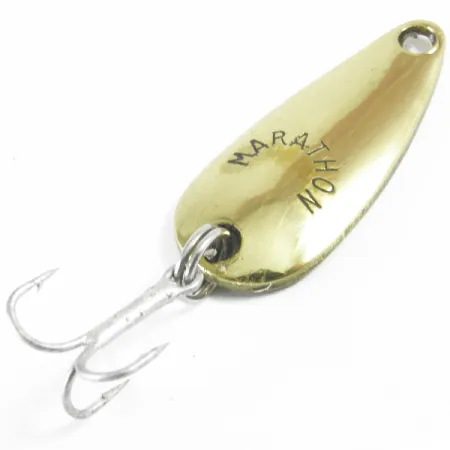 Aiškiai įgaubtame metaliniame paviršiuje įspaustas Marathon pavadinimas yra Viskonsino meistriškumo ženklas, priklausantis įmonei, gaminusiai žvejybos įrankius pusę amžiaus. Ši 3 cm (1 1/4 colio) blisgė pasižymi poliruotu aukso paviršiumi, kuris išlieka ryškus ant viso lašo formos korpuso. 4 g (1/8 oz) sveriantis masalas yra su sidabrinės spalvos trišakiu kabliu, pritvirtintu tvirtu žiedeliu apačioje. Produkto kodas 3640 identifikuoja šį konkretų JAV pagamintą egzempliorių, atspindintį Marathon Bait Company gamybos istoriją tarp 1929 ir 1979 metų. Metalinis paviršius yra puikios 5/5 būklės, išlaikantis švarią ir atspindinčią išvaizdą tiek priekinėje, tiek galinėje dalyje. Tiksliai išgręžta skylė smailėjančioje noselėje skirta valui ar suktukui tvirtinti.