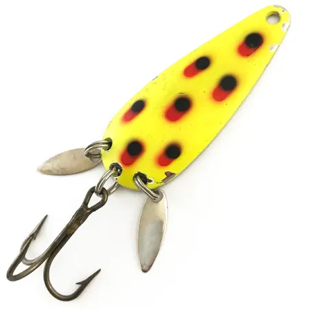 Aštuoni ryškūs juodi taškai ant raudonų akcentų puošia šios vintažinės vartiklės ryškiai geltoną paviršių. 2 1/4" (6 cm) ilgio ir 2/5 oz (12 g) svorio „Marathon Bait Company“ gaminys pasižymi unikalia konstrukcija – dviem sidabruotomis akustinėmis plokštelėmis, pritvirtintomis prie uodegos. Šios mažos, pailgos plokštelės skirtos gaudyti ir atspindėti šviesą būtent ten, kur yra aštrus trišakis kablys. Kitoje pusėje yra klasikinė nikliuota nugarėlė su giliu, lanku iškaltu „MARATHON“ pavadinimu – Viskonsine 1929–1979 m. veikusio gamintojo ženklu. Produktui suteiktas kodas 5410, vartiklė turi nedidelių praeities žymių su paviršiniais įbrėžimais prie kilpelės ir uodegos, todėl vertinama 4/5 būkle. Metalinės dalys, įskaitant žiedelius ir tamsaus paviršiaus trišakį kabliuką, išlieka tvirtos ir nepažeistos.