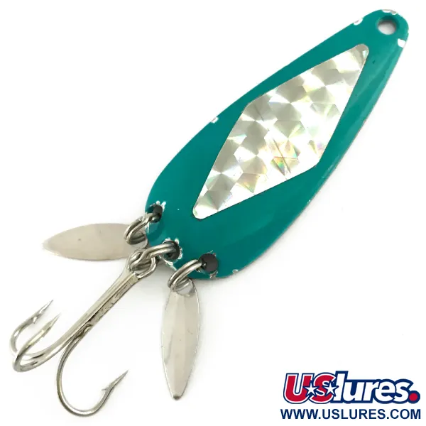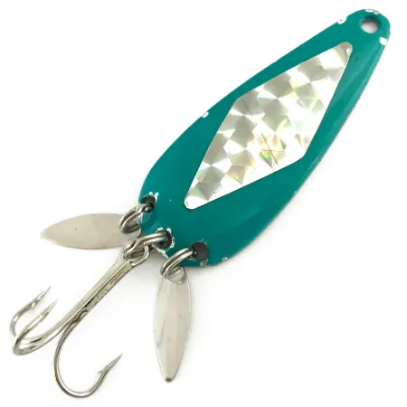 Melsvai žalia spalva ir prizminis deimanto formos intarpas apibūdina šios „Marathon Bait Company“ vintažinės blizgės išvaizdą. Prie galinio žiedelio kartu su trišakiu kabliuku pritvirtinti du pailgi sidabriniai mini lapeliai, skirti papildomam blyksėjimui ir patrauklumui traukiant masalą. Šis pavyzdys (produkto kodas 5640) yra 6 cm (2 1/4") ilgio ir sveria 12 g (2/5 oz). Kitoje masalo pusėje yra švarus, poliruotas metalinis paviršius su klasikiniu MARATHON gamintojo spaudu – tai Viskonsine 1929–1979 m. veikusios įmonės ženklas. Dažai ir šviesą atspindintis lipdukas yra išskirtinės būklės (įvertinimas 5/5). Furnitūra ir lapeliai neturi jokių korozijos žymių, todėl tai puikiai išlaikytas vidurio amžiaus Amerikos žūklės įrankių gamybos pavyzdys.