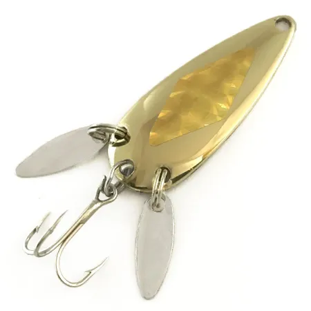 Šios paauksuotos 4,5 cm (1 3/4 colio) lašo formos blizgės centre yra briaunotas deimantinio rašto lipdukas. Ši Marathon blizgė sveria 8 g (1/4 oz), o jos įgaubtoje nugarėlėje tiesiai į metalą įspaustas prekės pavadinimas. Ant žiedelių prie uodegos pritvirtinti du sidabro spalvos pailgi mini lapeliai; šie „garsiniai lapeliai“ sukurti tam, kad sukurtų vizualinę žuvies jauko uodegos peleko iliuziją ir padėtų užmaskuoti trišakį kabliuką. Identifikuotas prekės kodu 6500, šis pavyzdys pagamintas Marathon Bait Company, Viskonsine, JAV. Auksinė apdaila ir furnitūra išlieka puikios būklės, o bendras įvertinimas yra 5/5.