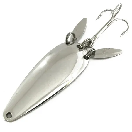 Poliruotas nikeliavimas dengia visą 6 cm (2 1/4") šios vintažinės blizgės korpusą – tai meistriškumo ženklas, būdingas „Marathon Bait Company“ per penkiasdešimt jos gyvavimo metų Viskonsine. Šis 12 g (2/5 oz) sveriantis masalas pasižymi unikalia konstrukcija: du maži, lašo formos garsiniai lapeliai pritvirtinti žiedeliais šalia kabliuko. Šie papildomi lapeliai atlieka dvejopą funkciją – suteikia papildomą blyksėjimą ir dalinai užmaskuoja didelį trišakį kabliuką, kad masalas geriau imituotų bėgančią žuvelę. Šis konkretus modelis, žymimas prekės kodu 7269, atspindi sumanią inžineriją, dėl kurios „Marathon“ tapo dominuojančiu JAV gamintoju 1929–1979 metais. Būklė yra puiki (5/5), metaliniai paviršiai išlieka ryškūs, o štampuotos detalės – aiškios. Viena švariai išgręžta kilpelė siaurajame gale užbaigia lašo formos dizainą, skirtą spiningavimui arba velčiavimui įvairiomis gėlo vandens sąlygomis.