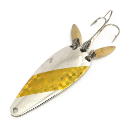Ši vintage blisgė pasižymi išskirtine auksine holografine įstriža juostele ant poliruoto nikelio korpuso, pabrėžiančia kūrybišką „Marathon Bait Company“ dizainą. Viskonsine 1929–1979 m. veikęs gamintojas šį 7546 modelį aprūpino unikalia dviejų lapelių konfigūracija gale. Du maži, auksinės spalvos gluosnio lapelio (willow) formos lapeliai yra pritvirtinti prie žiedelio šalia trišakio kabliuko, suteikiant papildomų šviesos atspindžių galinėje dalyje. 12 g (2/5 oz) svorio ir 6 cm (2 1/4") ilgio masalas yra puikios 5/5 būklės, atspindinti juosta ir metalo danga atrodo itin gerai išsilaikiusios. Kitoje štampuoto metalo pusėje yra švarus, lygus sidabrinis paviršius, būdingas to meto JAV pagamintai žūklės įrangai.