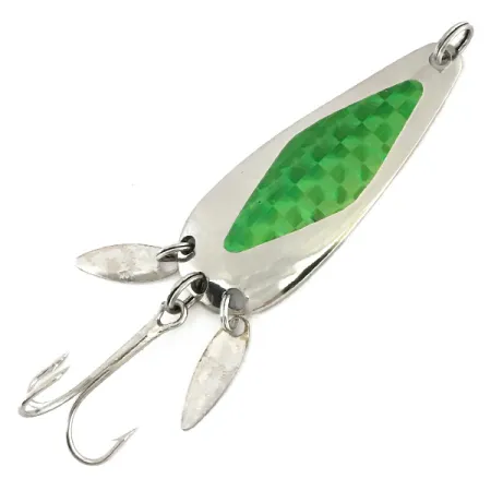 Nikeliuotas paviršius suteikia klasikinį pagrindą šiai 12g svorio Viskonsine pagamintai blizgei, kurios centre puikuojasi išskirtinis žalias holografinis žvynelių intarpas. Šis egzempliorius, pažymėtas prekės kodu 8582, demonstruoja naujovišką konstrukciją, kurią Marathon Bait Company naudojo 1929–1979 gamybos metais. Du maži, sidabro spalvos gluosnio lapelio formos vibraciniai lapeliai yra pritvirtinti prie žiedelio kartu su trišakiu kabliuku; jie skirti kelti vibracijas ir mirgančius šviesos atspindžius, kartu maskuojant kabliuko smaigalį. 6 cm ilgio masalas yra 5/5 būklės, išlaikęs poliruotą metalo blizgesį ir ryškius prizminio žalio lipduko kraštus. Konstrukcija išlieka tvirta, o bendras vaizdas atspindi vidurio amžiaus Amerikos meistriškumą, būdingą Marathon gamyklai. Šie pagalbiniai lapeliai imituoja masinės žuvies uodegos judesius traukiant ar velkiaujant. Sidabrinė korpuso ir lapelių apdaila sukuria vientisą vizualinį profilį.