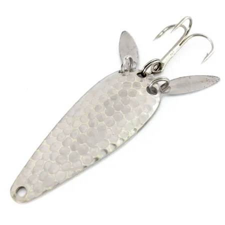 Kaltas nikelis suteikia šiai 12 g (2/5 oz) blizgei duobėtą paviršių, skirtą pagauti ir išsklaidyti šviesą taip, kaip negali lygūs metaliniai paviršiai. Šis konkretus 9910 modelis, kurio ilgis yra 6 cm (2 1/4"), pagamintas „Marathon Bait Company“, veikusios Viskonsine 1929–1979 m. Svarbi techninė charakteristika yra pora mažų, pailgų akustinių lapelių, pritvirtintų prie žiedelių šalia uodegos. Šie lapeliai atlieka dvejopą paskirtį: jie iš dalies užmaskuoja aštrų trišakį kabliuką ir sukuria papildomus vaizdinius blyksnius, skirtus imituoti masalinės žuvies uodegos judesius. Įgaubtoje pusėje yra aiškus „MARATHON“ įspaudas, nurodantis jos kilmę iš vieno produktyviausių Vidurio Vakarų amžiaus vidurio žvejybos įrankių gamintojų. Šis egzempliorius yra 5/5 būklės, išlaikęs ryškią, švarią apdailą tiek ant korpuso, tiek ant papildomos įrangos. Lašo formos profilis ir svorio paskirstymas tinka spiningavimui arba velkiavimui, kai reikalingas metalinis siluetas.