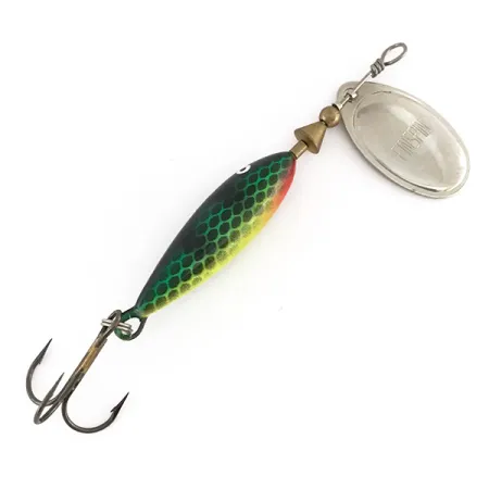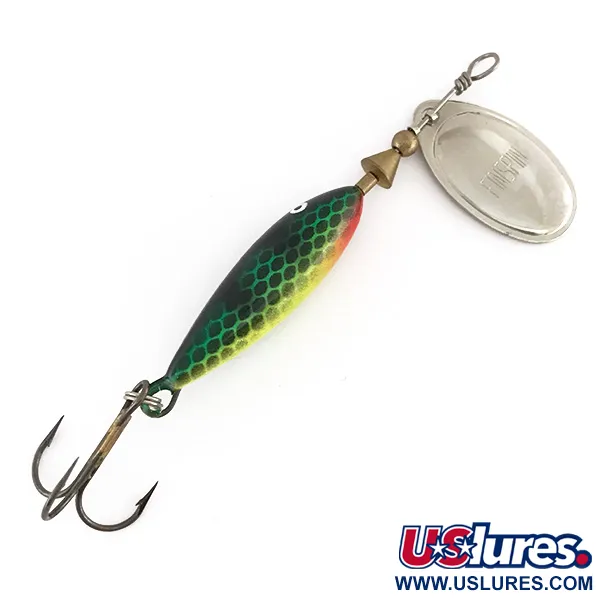 Ryškus žalias korio formos žvynelių raštas su geltonais ir juodais akcentais apibūdina šios Matzuo FinSpin sukrės korpusą, pažymėtą prekės kodu 7894. 8,25 cm (3 1/4") ilgio dizainas pasižymi poliruotu sidabro atspalvio gluosnio lapo formos lapeliu, ant kurio išspaustas modelio pavadinimas, pritvirtintu ant lankelio sukimuisi. 7g (1/4oz) svorio masalas pagamintas ant tvirtos vielinės ašies su žalvario atspalvio tarpikliais ir viršutine tvirtinimo kilpa. Dažyta apdaila išlieka ryški, su aiškiai apibrėžtomis akių detalėmis, o būklė vertinama 5/5. Matzuo dėmesys realistiškoms tekstūroms puikiai matomas žvynelių tinklelio gylyje, kuris papildo atspindinčius metalinius komponentus ir aštrų trišakį kabliuką, pritvirtintą per žiedelį.