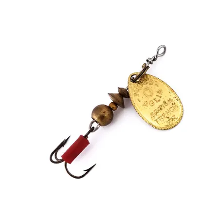 Šios 2,5 g (3/32 oz) sveriančios sukrės žalvarinis lapelis pasižymi aiškiu įspaudu, patvirtinančiu prancūzišką kilmę. Mepps Aglia 0 yra legendinio dizaino masalas, o šis egzempliorius, pažymėtas prekės kodu 10558, yra 4,5 cm (1 3/4") bendro ilgio. Auksinio atspalvio metale įspausti žodžiai „MEPPS AGLIA“ ir „BRITISH FRENCH PAT.“, o kitoje pusėje aiškiai matyti „MADE IN FRANCE“. Kūnelis sumontuotas iš tvirto žalvarinio rutuliuko ir dviejų kūginių žalvarinių tarpiklių ant nerūdijančio plieno vielos. Ant trišakio kabliuko kotelio užmauta išskirtinė raudona mova – klasikinė vizualinė vilioklė, kurią Mepps naudoja dešimtmečius. Šiuos masalus 1938 m. Prancūzijoje išrado Andre Meulnart, o vėliau jie buvo surenkami JAV naudojant importuotus prancūziškus komponentus. Šis pavyzdys yra 5/5 būklės, atrodo itin švariai, išlaikęs originalų metalo blizgesį. Lankelio ir kūgio sukimosi sistema sukurta tam, kad lapelis lengvai suktųsi tolygiai traukiant masalą.