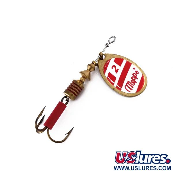 Raudoni ir balti dryžiai puošia šios Mepps Aglia 2 sukrės lapelio išgaubtą pusę – tai spalvinis motyvas, žinomas dėl puikaus matomumo. Ši 2 dydžio sukrė sveria 4,5 g (3/16 oz), ant jos dryžuoto paviršiaus aiškiai matomas žymėjimas ir skaičius 2. Kitoje lapelio pusėje yra įspaudas „MADE IN FRANCE“, nurodantis komponentų kilmę prieš juos surenkant JAV. 5,5 cm (2 1/4") ilgio (nuo kilpelės iki kabliuko linkio) masalas turi laiptuotą žalvarinį korpusą ir trišakį kabliuką su apsaugine raudono plastiko kembriku. Detalės išlaikytos puikios būklės, o tai rodo kruopštų šio egzemplioriaus saugojimą (būklė įvertinta 5/5). Šis gaminys kataloguojamas kodu 10075 ir turi standartinį žalvarinį lankelį, jungiantį besisukantį lapelį su ašimi.