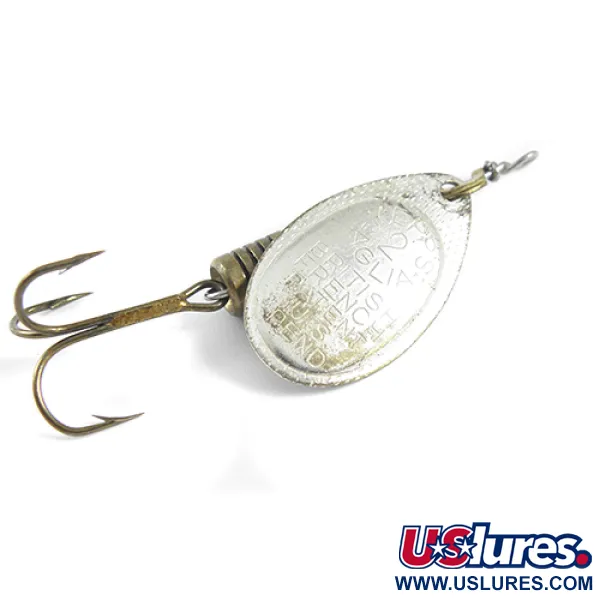 Ant sidabrinio lapelio aiškiai išmušti istoriniai prancūziškų ir britiškų patentų ženklai bei laukiančio JAV patento statusas. Ši Mepps Aglia 2, produkto kodas 1777, sverianti 3/16 oz (4,5 g) ir esanti 2 1/4" (5,5 cm) bendro ilgio, yra tikras žūklės paveldo eksponatas. Sidabrinė plataus lapelio apdaila suteikia klasikinį blyksnį, kurį papildo pakopinis žalvarinis korpusas, tarnaujantis kaip svoris ir balastas. Šio masalo konstrukcija byloja apie vidurio amžiaus perėjimą, kai Mepps komponentai buvo gaminami Prancūzijoje, o vėliau surenkami JAV – šis bendradarbiavimas sukėlė revoliuciją žvejyboje sukriukėmis. Įvertintas 4/5, šis pavyzdys yra ypač švarus, trišakis kablys išlieka aštrus, o vielos ašis tiesi. Kolekcininkai įvertins „AGLIA 2“ užrašo ryškumą, liudijantį apie to meto kokybės kontrolės standartus. Masalas turi ikonišką kūginę rotacijos sistemą, leidžiančią lapeliui pradėti suktis iškart pradėjus traukti.