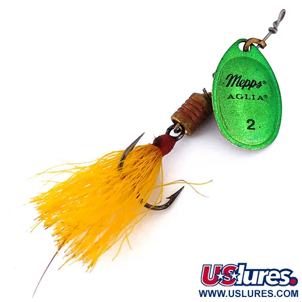 Ryški Green Metallic apdaila dengia 2 dydžio lapelį, ant kurio puikuojasi klasikinė „Mepps AGLIA“ markiruotė ir numeracija. Šis modelis yra 5,5 cm ilgio ir sveria 4,7 g. Kitoje lapelio pusėje ant sidabrinio metalo aiškiai matomas „MADE IN FRANCE“ antspaudas – tiesioginė sąsaja su originaliu 1938 m. Andre Meulnart dizainu. Kūnelį sudaro žalvario ir bronzos spalvos karoliukų seka, vedanti prie puošto trišakio kabliuko, apvynioto ryškiai geltonais šereliais. Ši Aglia 2 dressed sukrė, registruota produkto kodu 10197, reprezentuoja inžineriją, kurią Todd Sheldon išpopuliarino JAV septintajame dešimtmetyje. Įvertintas 5/5, masalas yra puikiai išlaikytas, su aiškiais užrašais ir nepažeista uodegėle. Vidinė kūgio rotacijos sistema ir vielos komponentai išlaikė pradinę padėtį.