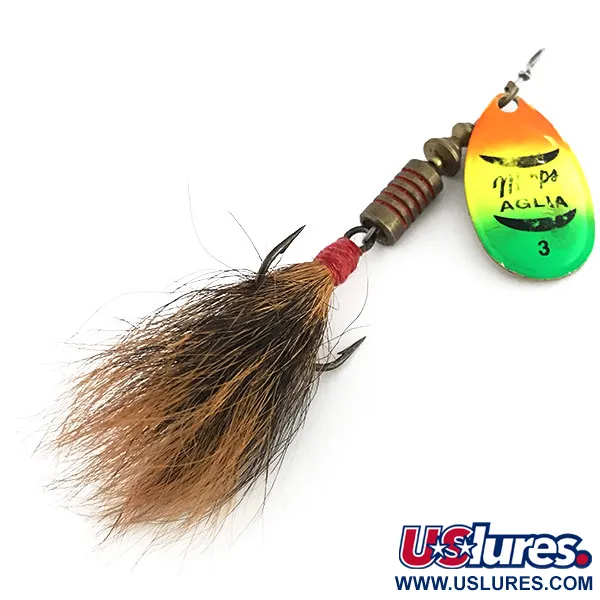 Ryškus trijų tonų oranžinės, geltonos ir žalios spalvų gradientas puošia šios 3 dydžio sukriukės lapelį, padengtą fluorescencine UV danga geresniam matomumui. 4,7 g (3/16 oz) svorio Mepps Aglia 3 dressed UV pasižymi klasikinės prancūziškos gamybos lapeliu, kurio priekinėje pusėje įspausta „Mepps Aglia 3“, o kitoje – „Made in France“. Šis konkretus egzempliorius, pažymėtas produkto kodu 8812, yra 5,5 cm (2 1/4") ilgio nuo kilpelės iki trišakio kabliuko išlinkimo. Pats kabliukas papuoštas rankomis surišta natūralaus voverės ir elnio kailio puokšte, pritvirtinta ryškiu raudonu siūlu, kad vedimo metu būtų užtikrintas natūralus profilis ir subtilus pulsavimas. Žalvarinį korpusą sudaro suverti karoliukai ir balnelis, leidžiantis lapeliui sklandžiai suktis vos palietus vandenį. Komponentai atspindi Prancūzijos inžinerijos ir JAV surinkimo derinį, būdingą Viskonsine įsikūrusios Mepps US asortimentui nuo 1960-ųjų. Masalas turi tik nedidelių naudojimo žymių ir yra puikios 4/5 būklės, su aiškiais užrašais ir gerai išlikusia kailio puokšte. Kita lapelio pusė yra poliruoto aukso spalvos metalo, būdingo Aglia serijai, kuris kontrastuoja su ryškiomis spalvomis priekyje.