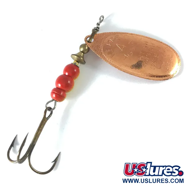 Varinė apdaila, tokia kaip šio 4 dydžio lapelio, yra nepakeičiama žvejams, dirbantiems drumstame vandenyje arba žvejojantiems esant debesuotumui. 9 g (1/3 oz) sverianti Mepps Aglia 4 pasižymi klasikiniais Prancūzijoje pagamintais komponentais, kurie sukūrė pasaulinę prekės ženklo reputaciją po André Meulnart 1938 m. išradimo. Ant paties lapelio nugarėlės yra aiškus 'MADE IN FRANCE' spaudas, specifinis jo paveldo ir kilmės ženklas. 7 cm (2 3/4") bendro ilgio masalas sukonstruotas su trimis pereinamų oranžinių-raudonų spalvų karoliukais, suvertais prieš tvirtą žalvarinį svorį ir lankelį. Šis egzempliorius, identifikuojamas prekės kodu 3629, pasižymi gerai išlaikyta furnitūra ir yra įvertintas 4/5 būklės balu. Trišakis kablys saugiai pritvirtintas prie vielos ašies, o ant varinio paviršiaus išspaustas užrašas 'MEPPS AGLIA 4' išlieka ryškus ir įskaitomas natūralaus metalo spindesio fone.