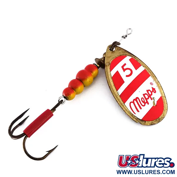 Žalvariniai šios 5 dydžio sukrės komponentai pasižymi šiltu, natūraliu senėjimu, kuris ypač matomas kitoje lapelio pusėje, kur „MADE IN FRANCE“ įspaudas išlieka ryškus ir aiškus. Šis 14 g (1/2 oz) svorio modelis pasižymi ryškiu raudonai ir baltai dryžuotu raštu išgaubtoje lapelio pusėje, kurį papildo klasikinis logotipas ir skaičius 5. 8 cm (3 1/4") profilis sukurtas ant tvirtos vielinės ašies, suvertos graduotais raudonais karoliukais, kurie ties sąlyčio taškais turi subtilų geltonai oranžinį perėjimą. Šioje konstrukcijoje naudojama kūginė rotacijos sistema – 1938 m. prancūzų inovacija, leidžianti lapeliui laisvai suktis aplink centrinę ašį. Apačioje pritvirtintas aštrus trišakis kablys, apsaugotas raudono plastiko vamzdelio segmentu, derančiu prie karoliukų mazgo. Produktas, pažymėtas kodu 10136, yra 4/5 būklės, su gerai išsilaikiusiu emaliu ir švariomis metalinėmis dalimis.